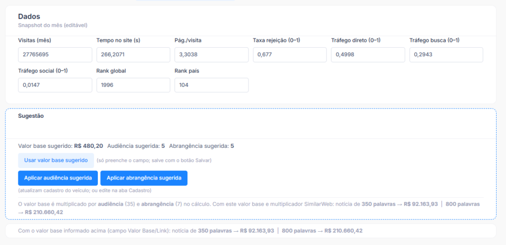 Um site com alto tráfego qualificado, onde o leitor permanece engajado em um texto longo, gera um valor publicitário altíssimo. O algoritmo compreende essa dinâmica e ajusta a valoração da inserção digital de acordo com o tamanho de cada texto e o impacto real daquela audiência.